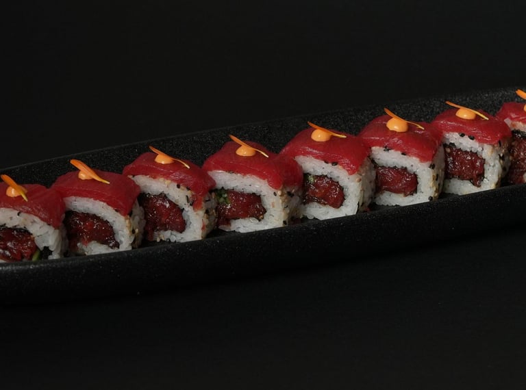 Mix de atún picante, pepino, mayo picante, akami y chips de ajo.